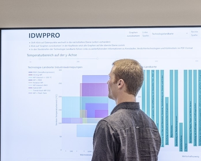 Basierend auf dieser Analyse haben die Wissenschaftlerinnen und Wissenschaftler ein interaktives Tool entwickelt („Technologie-Landkarte“), das die verfügbaren Wärmepumpentechnologien relevanten Industrieprozessen gegenüberstellt. Die Online-Anwendung bietet zwei Visualisierungen: Die erste Grafik zeigt die verschiedenen Wärmepumpentechnologien abhängig von der Wärmeleistung und dem Temperaturbereich auf Seite der Wärmesenke. Die zweite Grafik bildet wesentliche Wirtschaftsbranchen und deren benötigte Prozesstemperaturen ab. Beide Grafiken sind so angeordnet, dass eine effektive Zuordnung möglich ist. Unternehmen können also anhand des Tools die für ihre Prozesse geeignete Wärmepumpe identifizieren.
