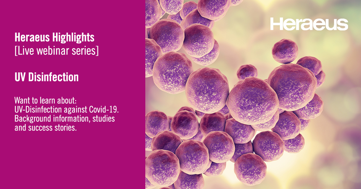 Heraeus Noblelight kündigt eine vierteilige Webinar-Reihe an, „Heraeus Highlights: UV-Desinfektion“, die am 2. Februar 2021 beginnt. Die Webinar-Serie konzentriert sich auf Informationen über den Einsatz von UVC (UVGI)-Desinfektion zur Bekämpfung von COVID-19 auf Oberflächen und in der Luft, in Gebäuden und im Transportwesen. In jedem Webinar erfahren die Teilnehmer von Experten, was sie wissen müssen, um zu entscheiden, ob die UVC-Desinfektion ein Mittel ist, das sie in ihre COVID-19-Gesundheits- und Sicherheitsprotokolle und in die Belüftungssysteme von Gebäuden oder Verkehrsmitteln einbauen sollten, um die Gesundheit und das Wohlbefinden von Mitarbeitern, Schülern und der Öffentlichkeit zu gewährleisten.